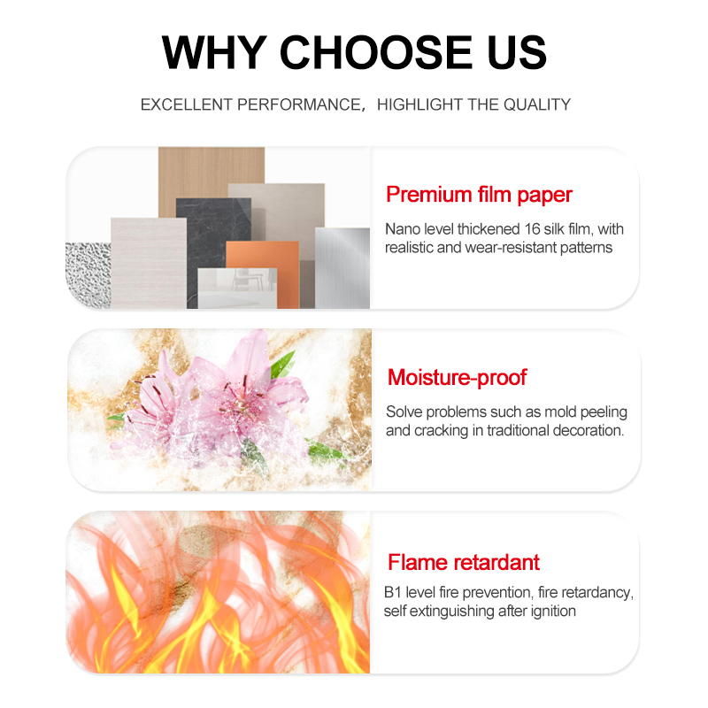 Through long-term research and experiments, we have successfully improved the parameters of our products, making our main products wall panels more durable, waterproof, moisture-proof, flame retardant, environmentally friendly and easy to install. The wall panels are widely used for various interior decoration, such as living room, bedroom, office, hotel, school and so on.