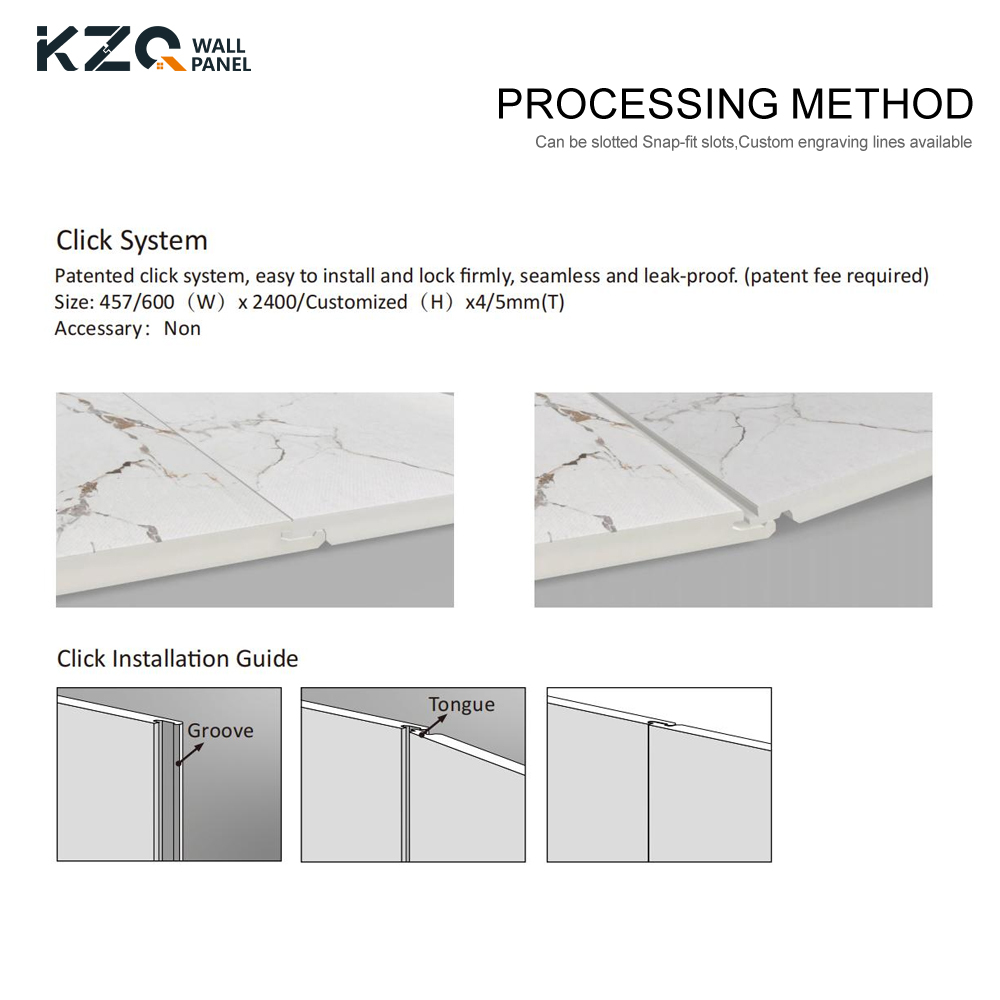 لوح الجدار SPC متوفر بسماكة 4 مم و 5 مم، مما يجعله مناسبًا لاحتياجات التركيب المختلفة. نظام تركيب Unilin Lock يجعل التركيب سهلاً، مما يوفر الوقت والجهد. تصميم حجر النقر لبلاط لوح الجدار SPC مناسب للتركيب بنفسك على الحائط، ويمكن استخدامه أيضًا كأرضية.